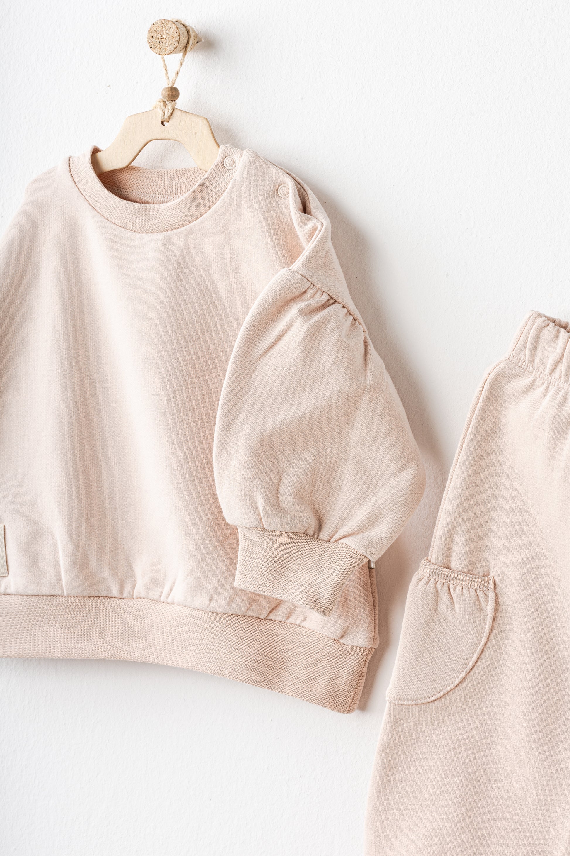 Ky komplet për bebe përfshin dy pjesë të rehatshme dhe praktike, të dizajnuara për përdorim të përditshëm. Materiali i butë dhe i frymëmarrshëm është i përshtatshëm për lëkurën e ndjeshme të foshnjës, duke i ofruar rehati gjatë gjithë ditës. Stili minimalist e bën të lehtë për t’u kombinuar me veshje të tjera.