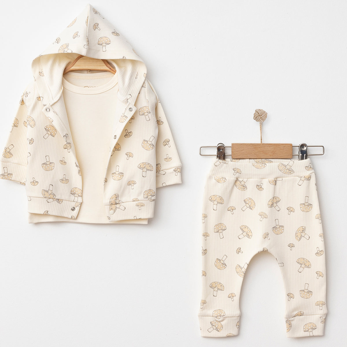 Ky kombinim prej tre pjesësh përfshin një duks të butë me kapuç, një bluzë të rehatshme dhe pantallona të përshtatshme për lojë dhe rehati gjatë gjithë ditës. Dizajni me kërpurdha i jep një pamje tërheqëse dhe lozonjare veshjes së përditshme të fëmijës suaj.
