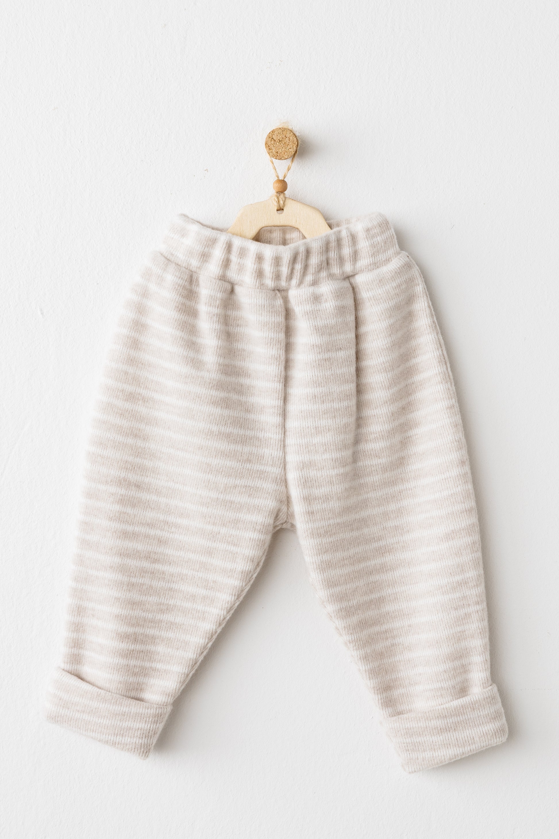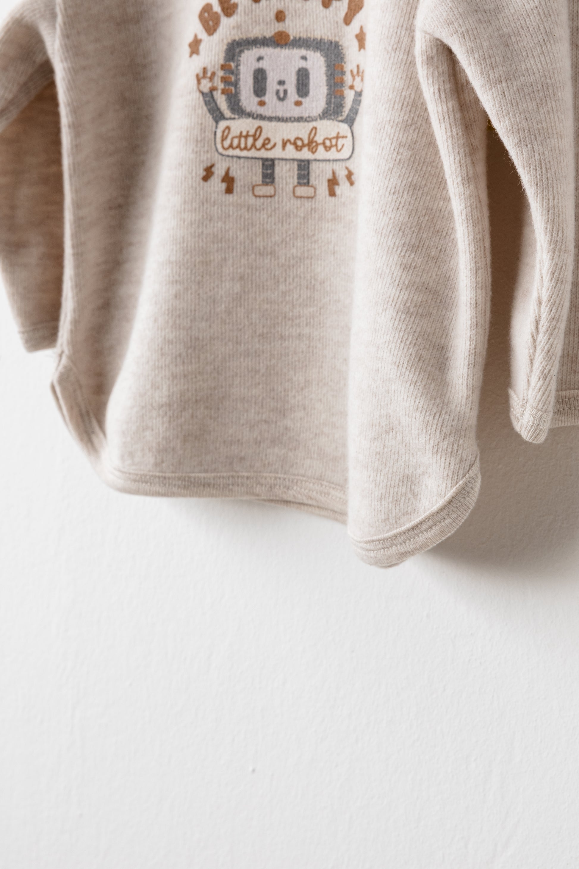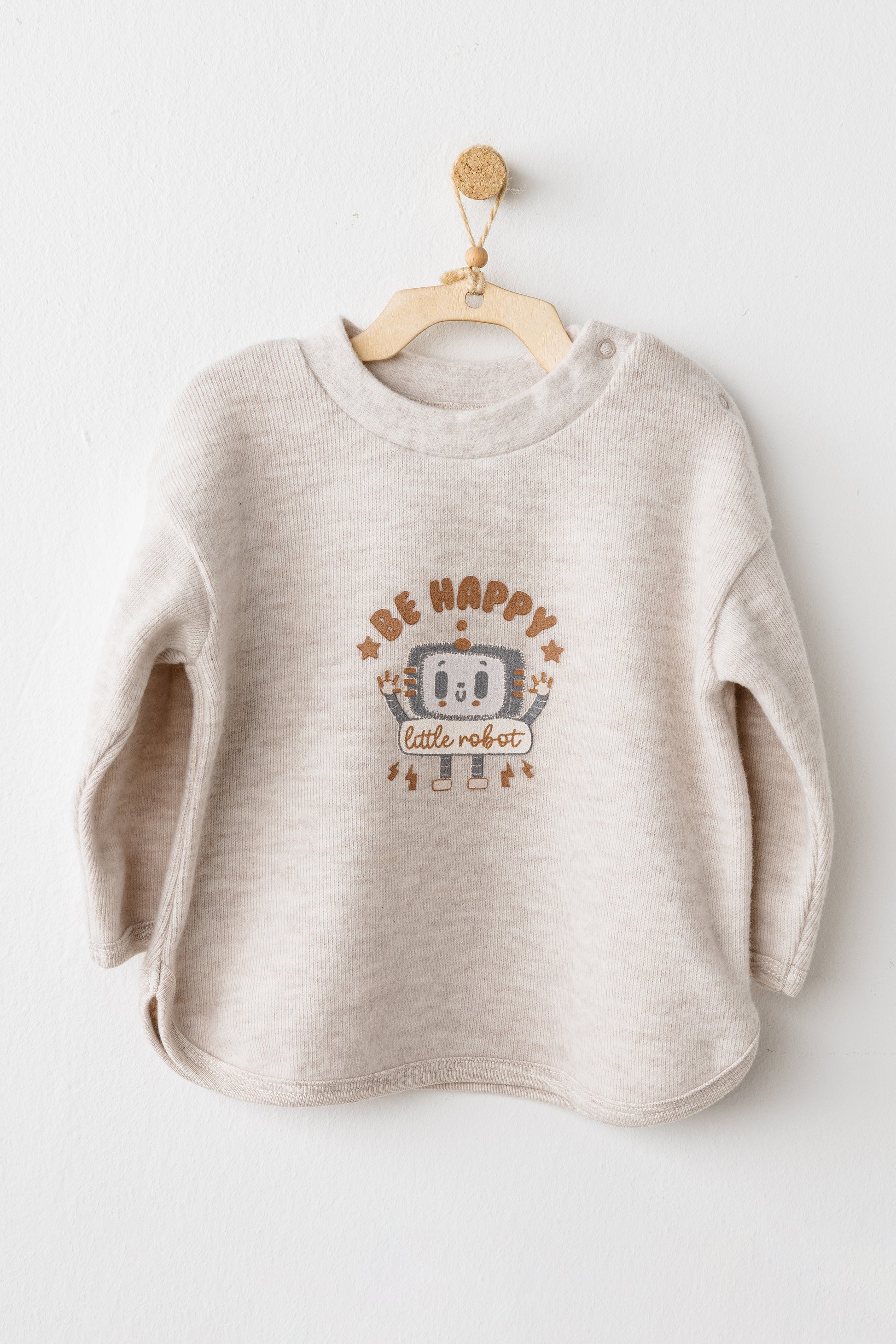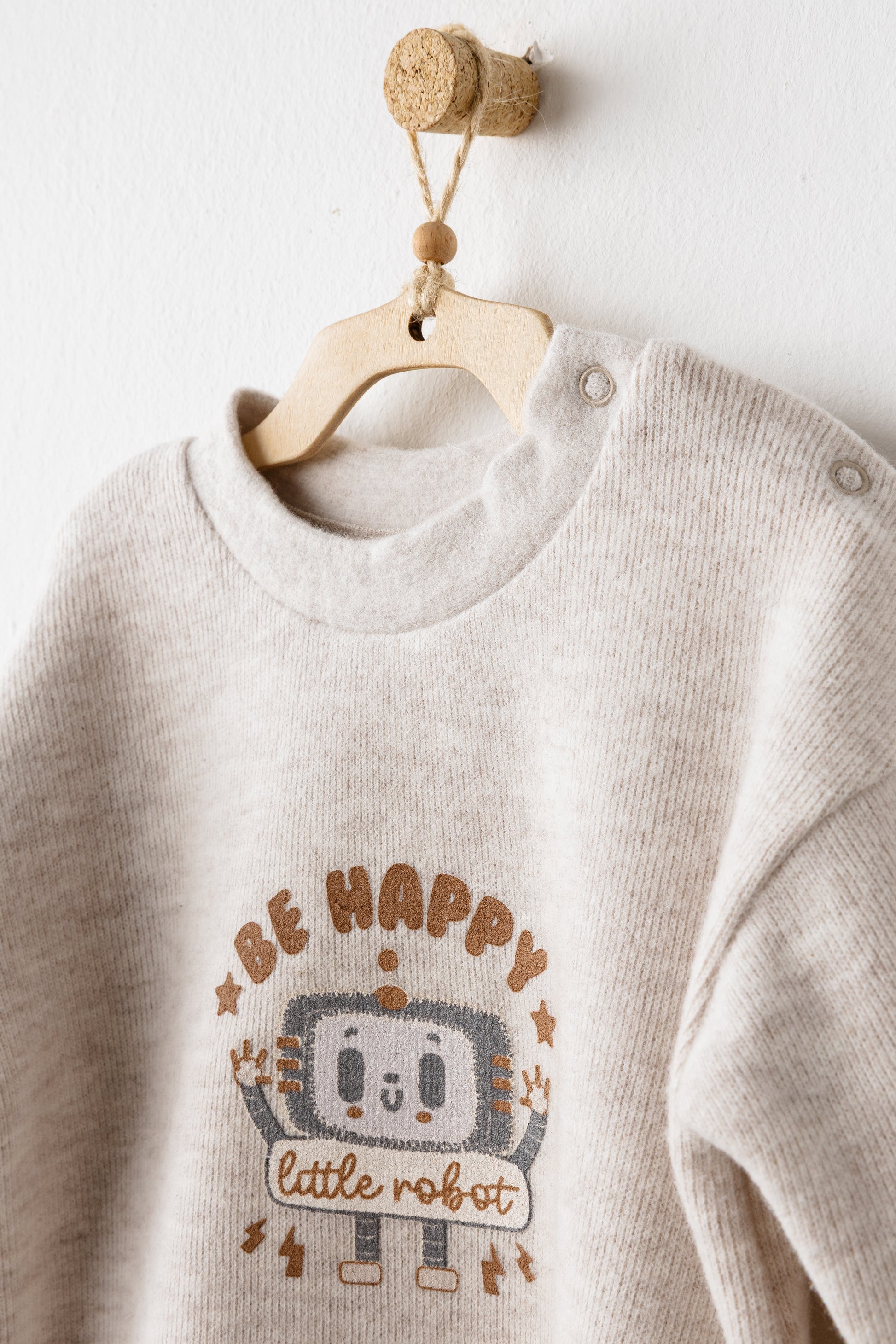 Ky set i butë dhe i rehatshëm për bebet përfshin një duks me kapuç dhe pantallona të koordinuara, me ilustrim të një roboti të ëmbël dhe shkrimin “Be Happy”. Ideale për lojë, shëtitje dhe ditë plot buzëqeshje.