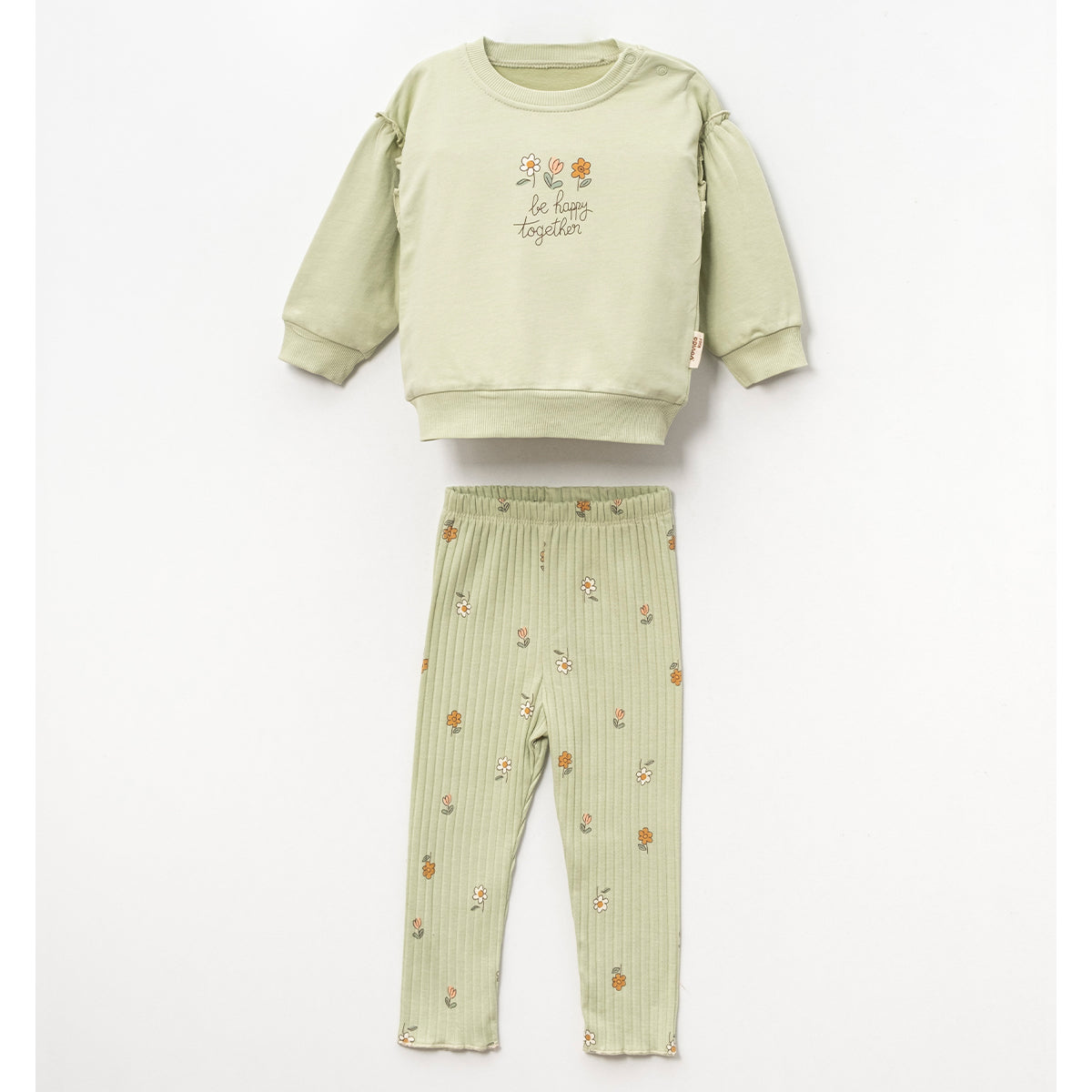 Një set i ëmbël dhe i rehatshëm për vogëlushen tuaj, perfekt për ditët e freskëta të pranverës. I përbërë nga një duks dhe pantallona të kombinuara, ky set vjen në një nuancë të lehtë të gjelbër dhe është zbukuruar me lule të vogla që shtojnë hijeshi dhe freski.
