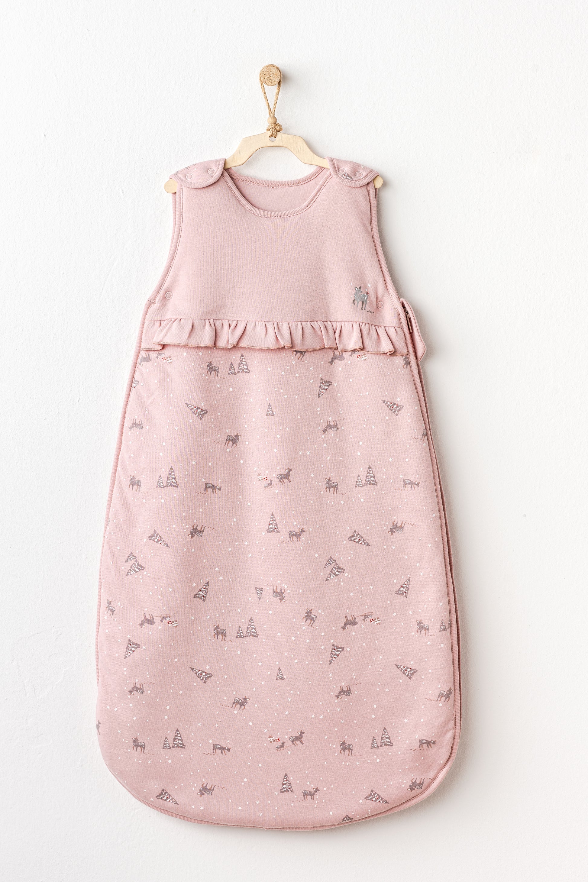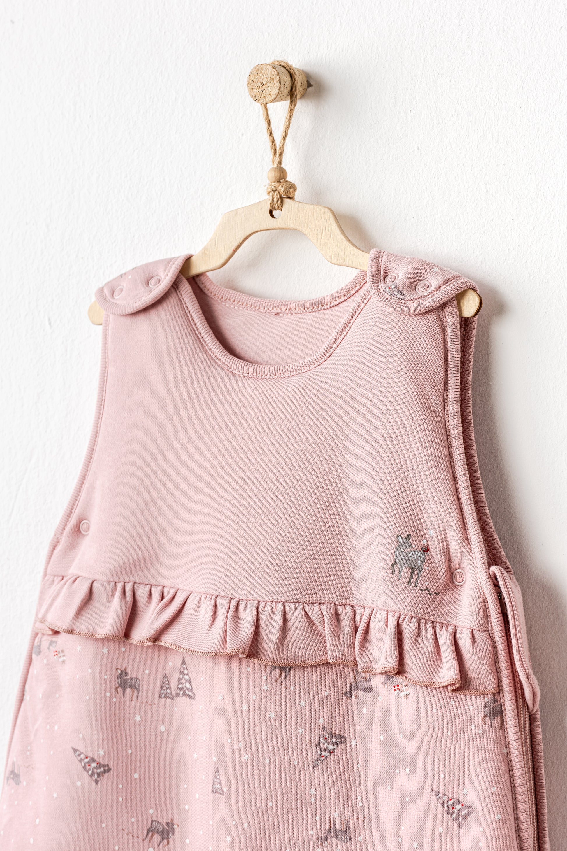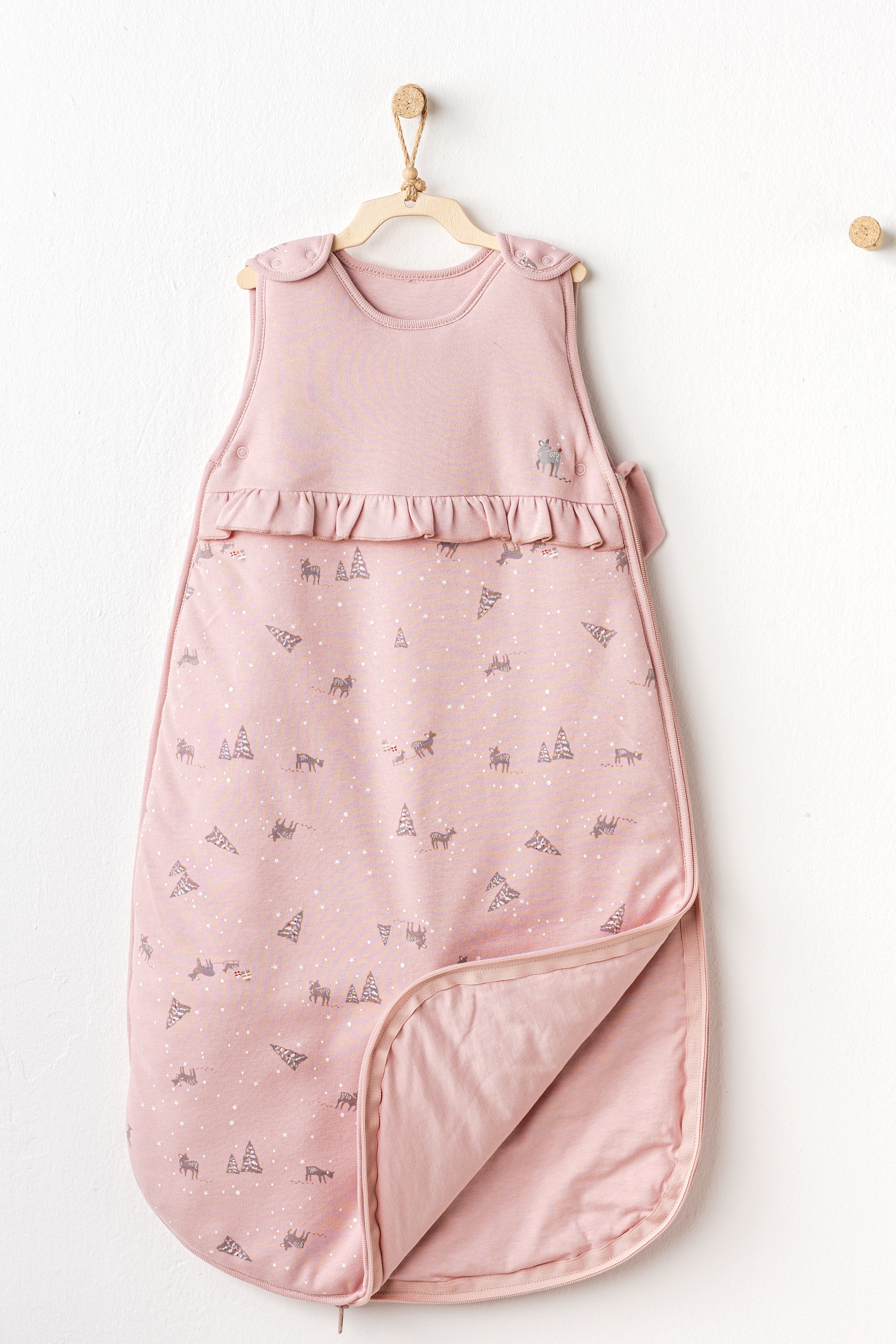 Thes gjumi i butë për bebe, 2.5 Tog, në ngjyrë rozë, me dizajn të ëmbël pishash dhe drenushash – perfekt për gjumë të qetë dhe të ëmbël.