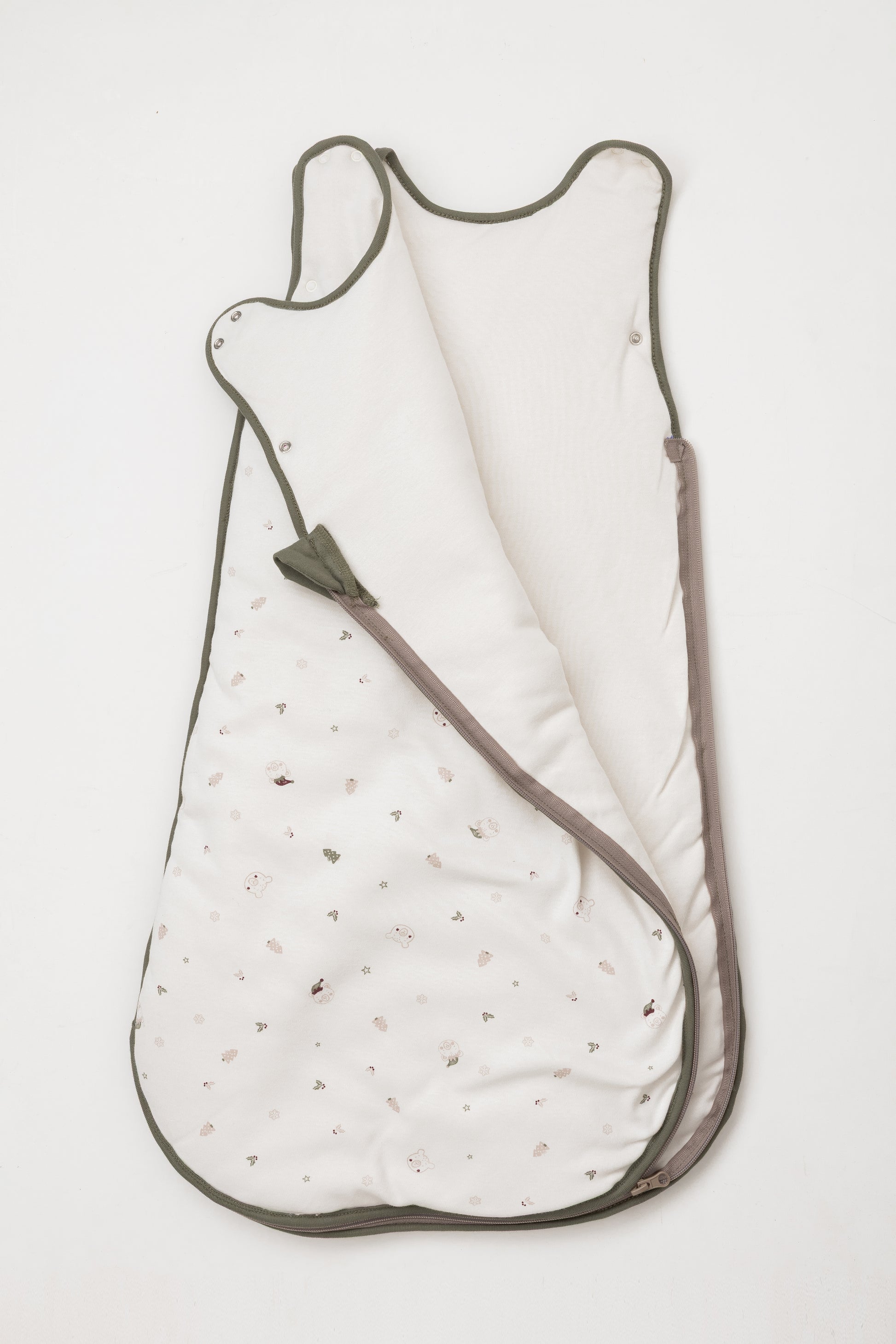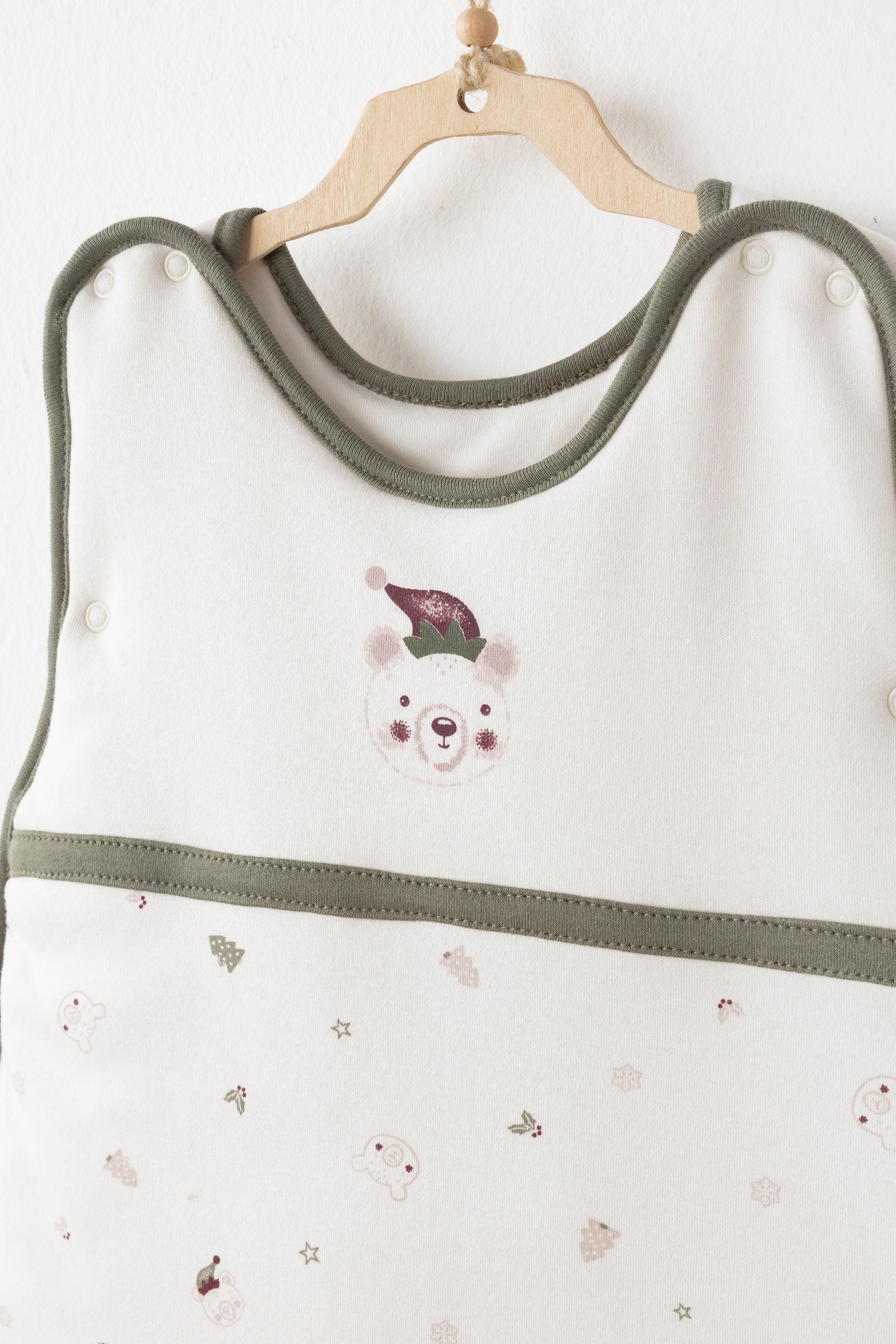 Thes gjumi 2.5 Tog, i bardhë, i rrethuar me detaje të gjelbra, me motiv arushi me kapuç “Babadimri” dhe disa pisha të vogla – perfekt për gjumë të qetë dhe ëmbël për vogëlushin tuaj.
